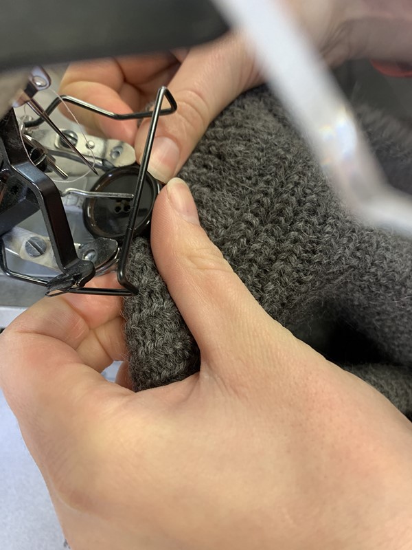 Earlier this month, when the factory in London was working on a re-order of the Hardingham and Charlie scarves and the Codling cardigan in a new colour, as I couldn’t actually be there, I asked them if they could take some photos of the process so I could show you what it’s like behind the scenes at the factory; I wanted to share with you the excitement of watching the knitting emerge from under the machine bed and the expertise of the linkers and hand finishers who are so skilled in piecing together the garments, weaving in the loose ends and attaching the buttons and labels.