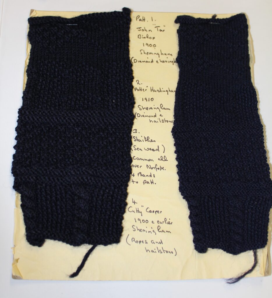 The stitches knitted into the Norfolk Ganseys range from “wedding bands” and “hearts” from the family, “rungs and furrows” from farming, weather conditions like “hailstones” and “bolts of lightning” to more nautical stitches like “coils o’ rope” (cables), “herrings”, “fishing nets” and “flags”.