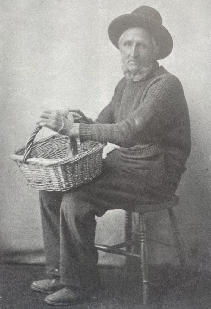 The Norfolk fishing communities were virtually self-sufficient, they made their own baskets, underwear, boats, nets, crab pots and of course Gansey jumpers. Abraham Cooper (pictured here) was probably on his fish-round from door to door when Olive Edis (photographer) asked him to sit for this study. The fishermen used wicker baskets to store and sell their catch; the more open weave baskets were used when the fish were caught as they would let the water drain through and the square baskets (pictured above) were used to sell the fish back on dry land. The beautiful thing about wicker baskets is that they can only ever be woven by hand. The tension and technique of the weaver can be seen in the construction – in the same way as a knitted Gansey jumper, making each basket or Gansey unique to the maker.