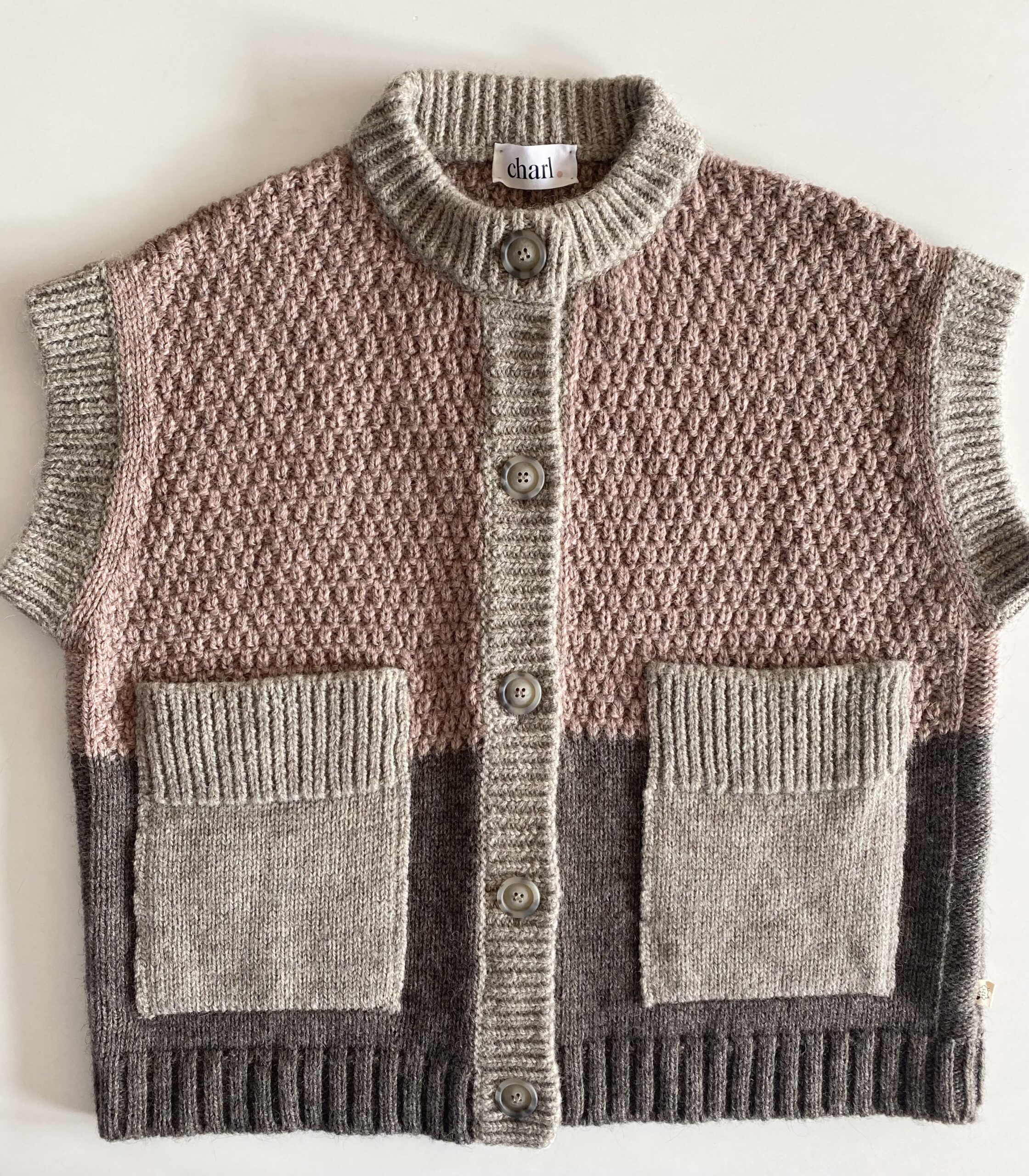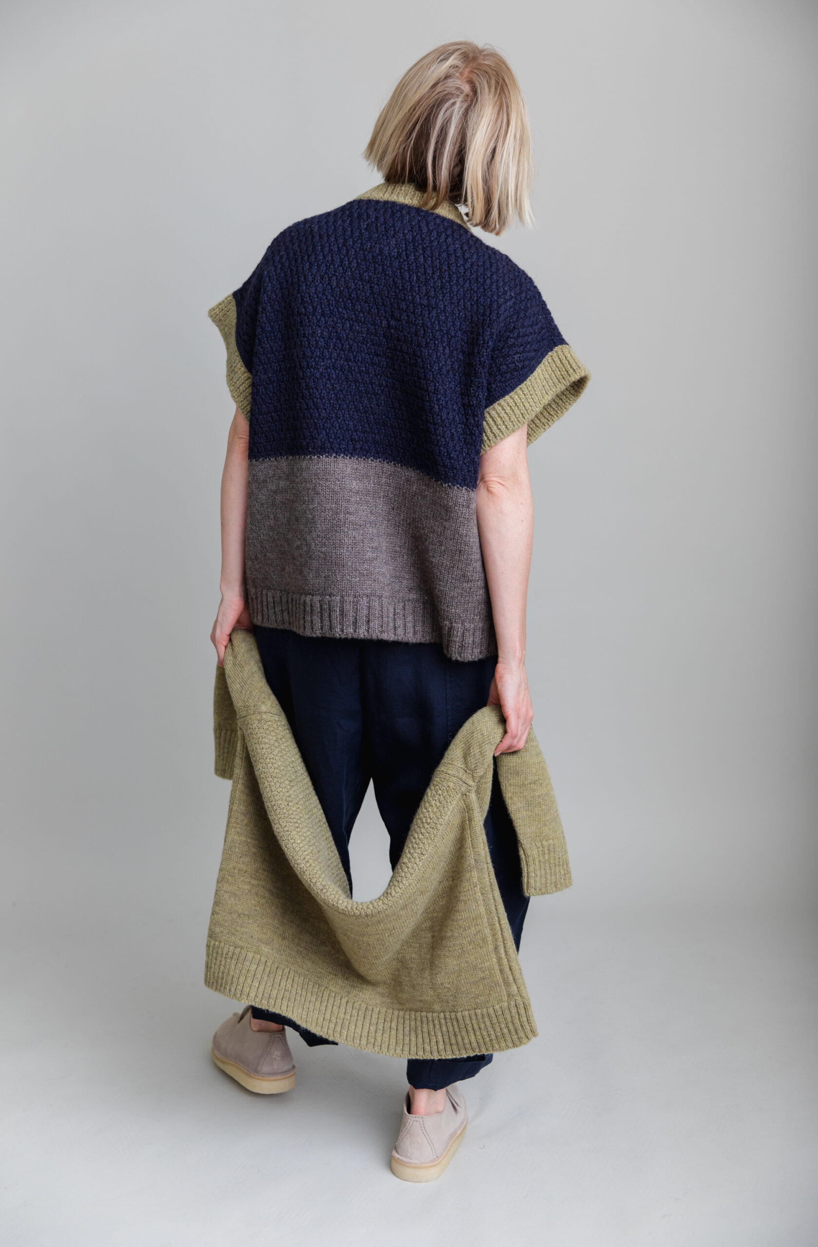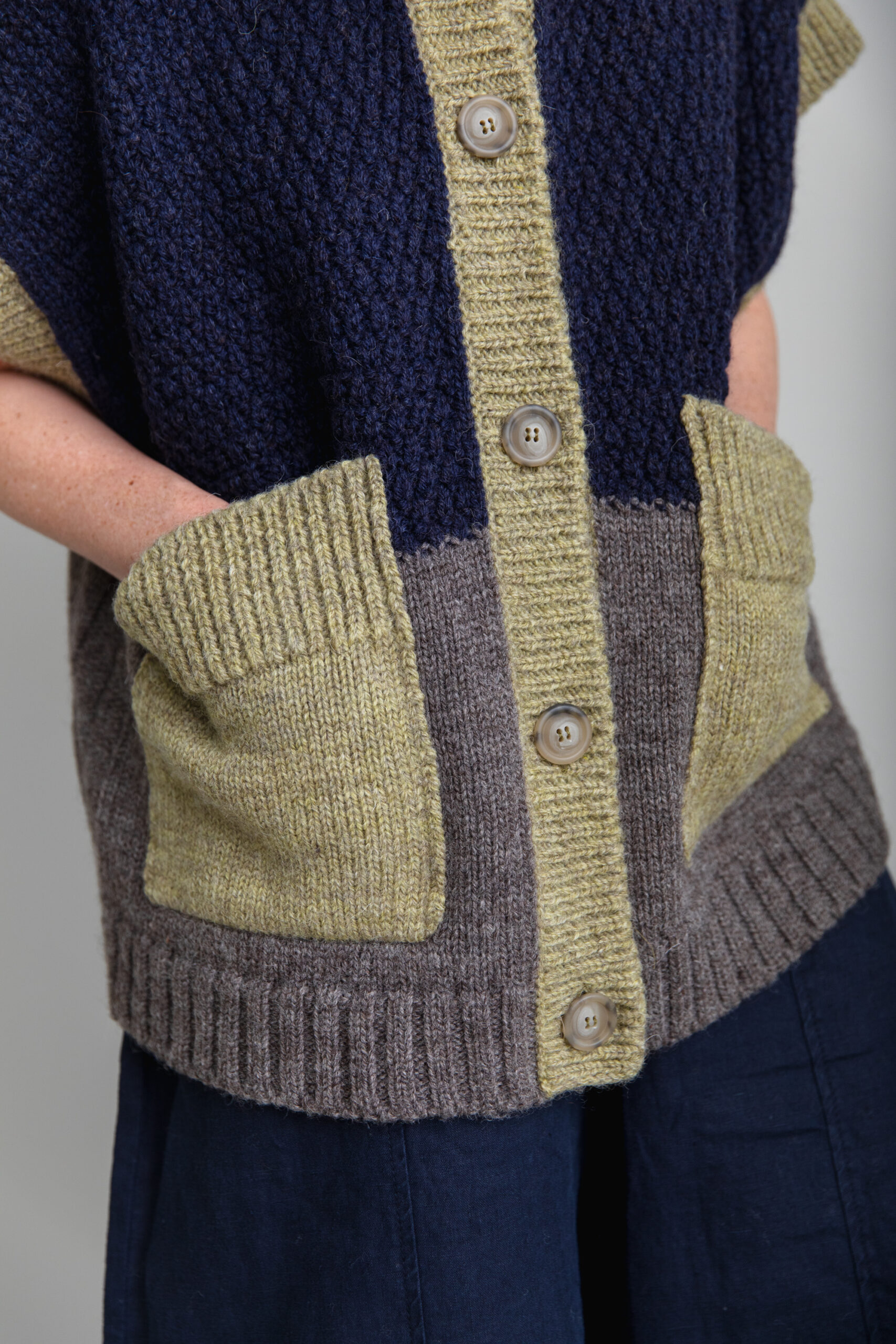 Part of the “Make Do and Mend” Autumn ’24 collection, which is inspired by the Norfolk Fishermen’s Gansey jumpers and the resourcefulness of their knitters who unravelled and mended the jumpers when they became worn, knitting the mended areas in whatever wool they had to hand, often in a slightly different colour. Bigby is a chunky crew neck knitted gilet with roomy proportions, an original “hailstone” stitch on the top half of the body and contrasting pockets, button placket and neck trim.