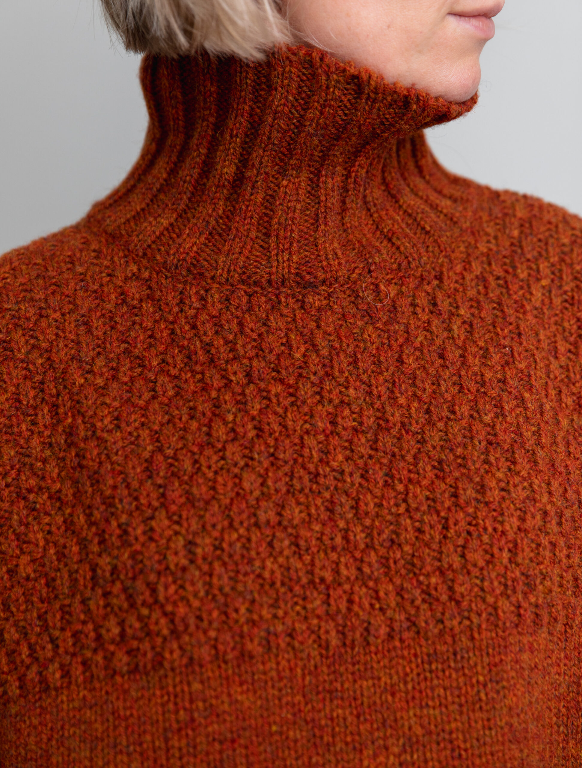Available this season in Blood Orange, Surf White and Pine Green. This cosy unisex jumper is slightly over-sized in fit; the ideal piece to pull on when the coastal breeze picks up. The high ribbed funnel neck can be worn up or folded down. The top half of the body is knitted in a heritage “hailstone” stitch found on the original Ganseys and trimmed with a wide rib at the hem which does not pull in. A boxy shape with a gently curved hem line and slightly long sleeves.