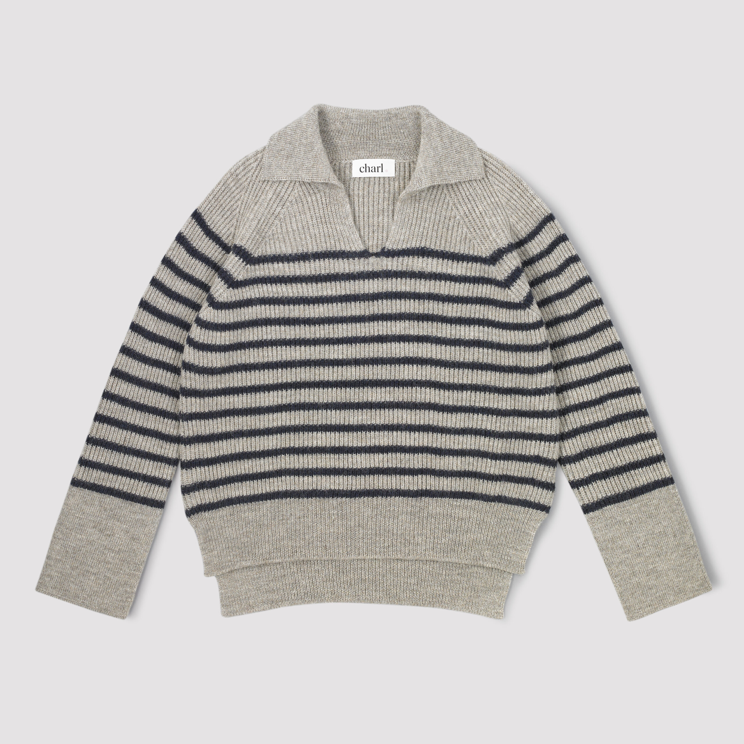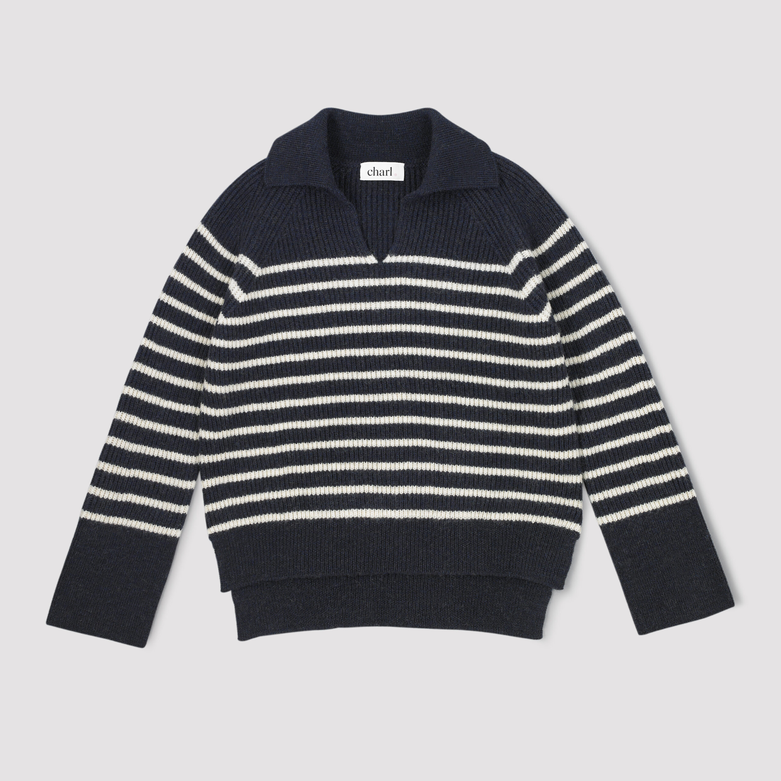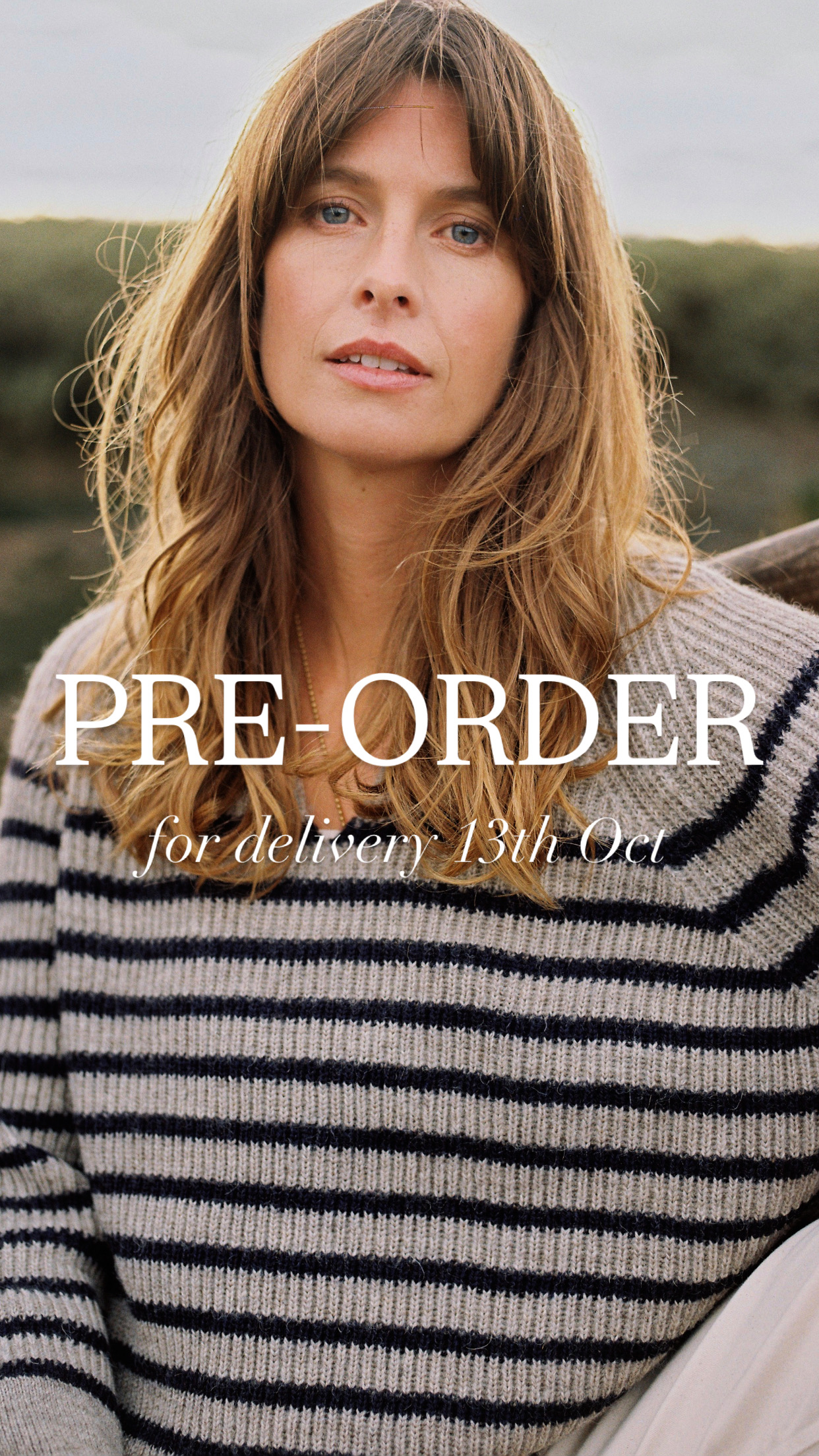 The Edie jumper takes its cue from the traditional nautical knitwear worn by Norfolk fishermen in the 19th and early 20th centuries. With timeless nautical stripes and a classic polo collar, it’s a piece that feels both nostalgic and modern.