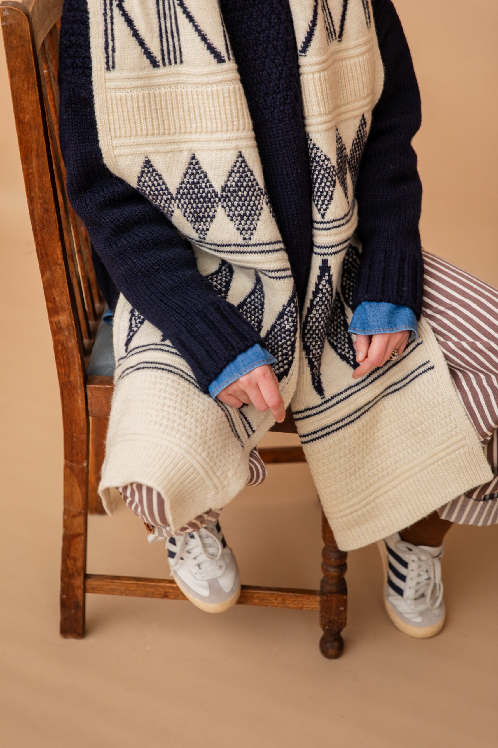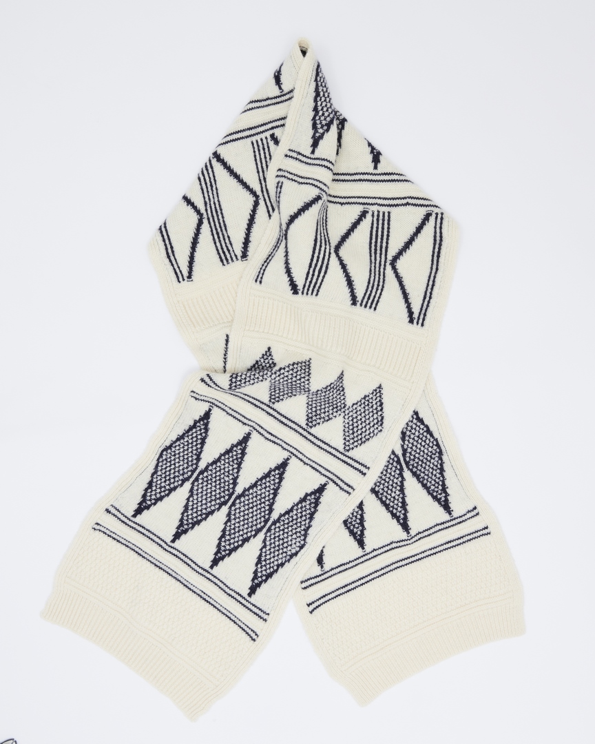 This is a luxuriously large scarf, designed to be worn wrapped high around the neck keeping its wearer warm and snug. The reverse knit of the jacquard pattern is equally attractive and tightly knitted to ensure of no snaring.