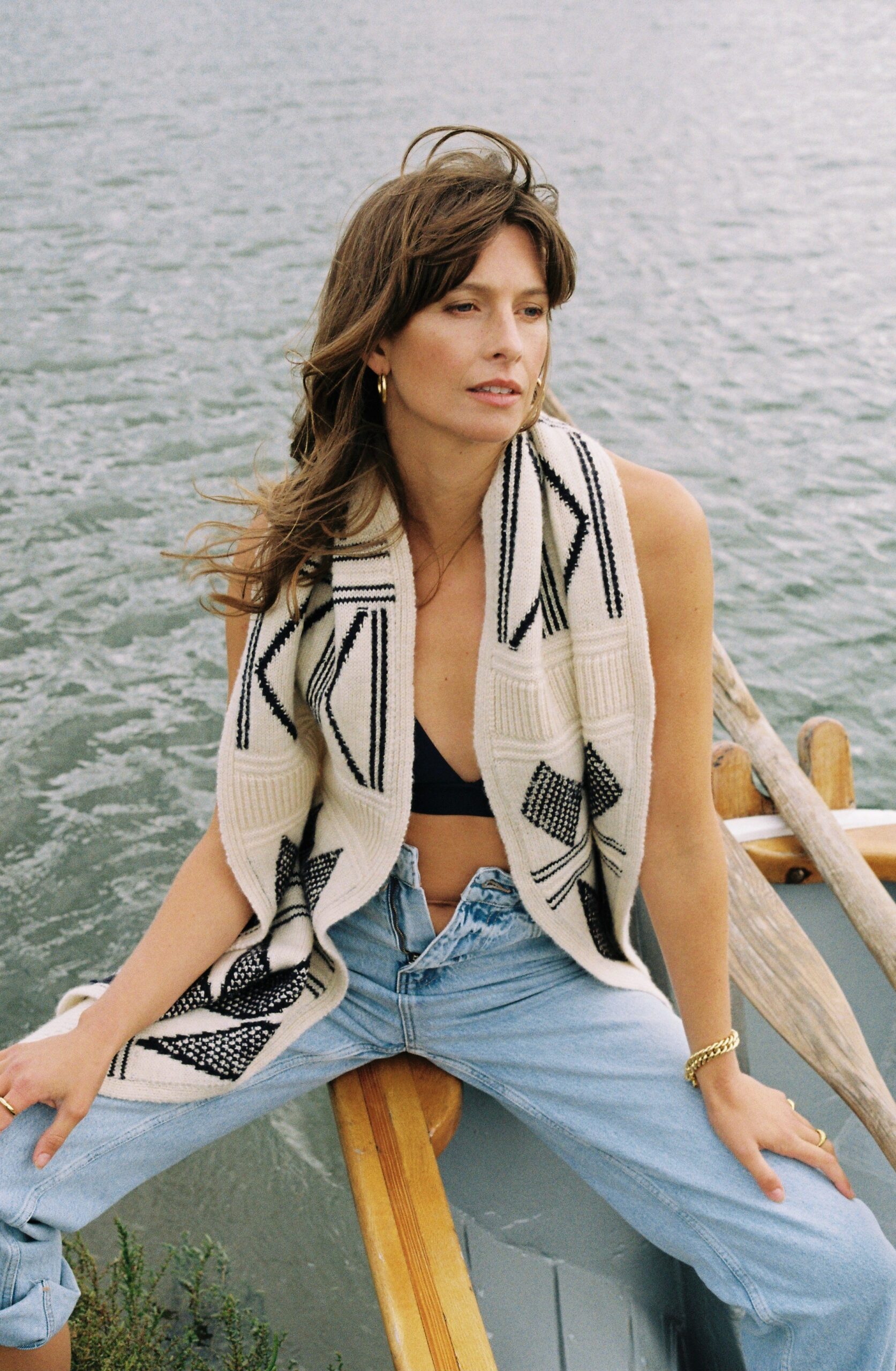 The scarf measures approximately 187cm long by 30cm wide and is knitted 2 ply on the chunky 5 gauge machine. It comes in one size and one colour; a creamy white base with a Gansey blue pattern to best show off this eye catching design.