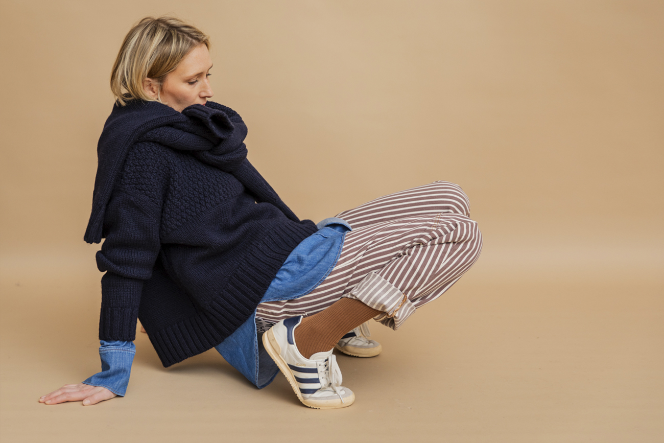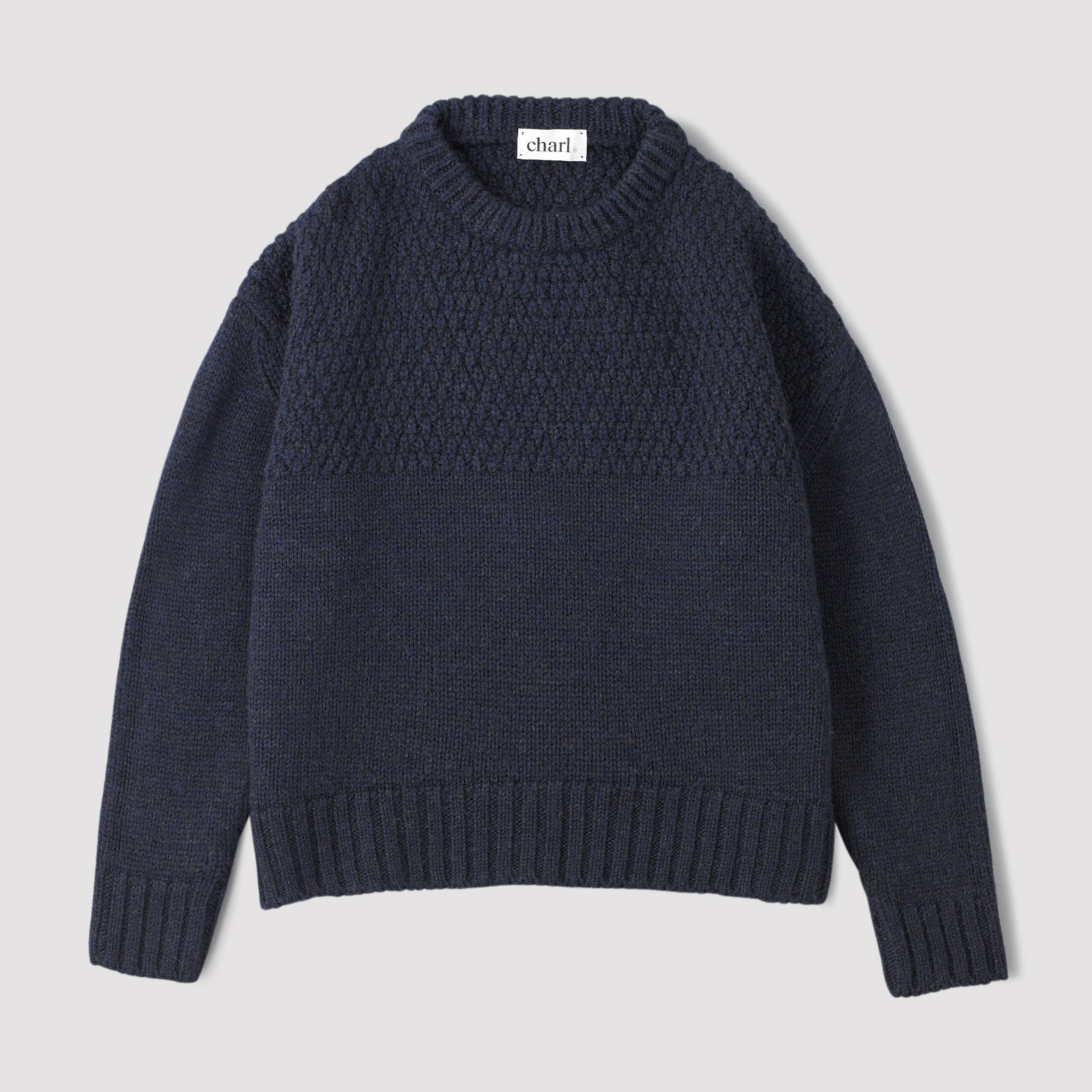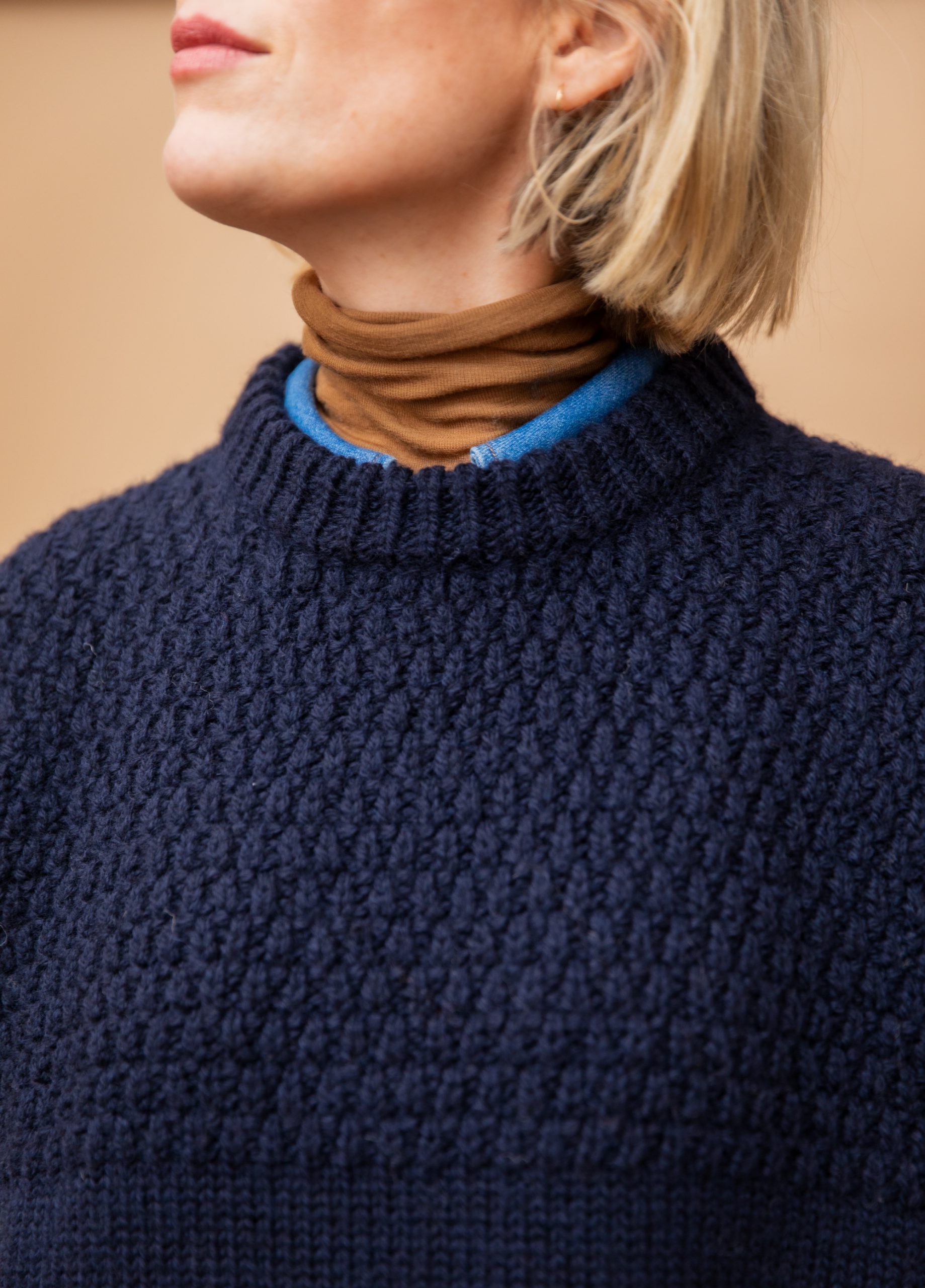 This generous yet modern fit jumper now comes in three sizes: XS/S fits women’s size 8-10, S/M fits women’s sizes 8-12 and M/L fits women’s size 12/14. The generous, boxy proportions mean this style is a modern interpretation of a classic Gansey with a curved hem which creates a flattering hemline. Model wears size S/M.